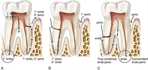 There are also cases where an existing lesion of the periodontal component can travel in a reverse direction, enter through the roots of the tooth and thus go on to infect and inflammate the pulp. This type of Endo-Perio lesion is called retrograde pulpitis.